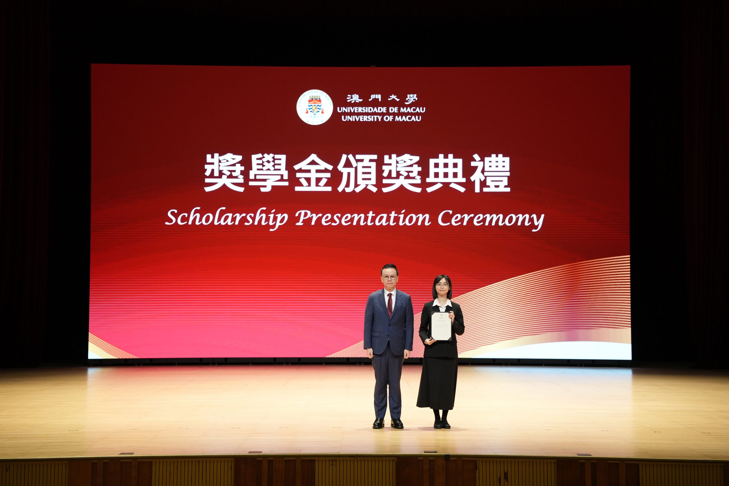 The University of Macau held the “Scholarship Presentation Ceremony 2025” on November 26, 2025, to honor 430 outstanding students with scholarships and academic awards. Among these were the “ Macau Tung Sin Tong Scholarship” and the “Macau Buddhism Foundation Scholarship”, promoted by the CMS and supported by the Macau Tong Sin Tong and the Macau Buddhist Foundation. The scholarship recipients for the 2024/2025 academic year, including PhD and Master’s students, were selected through various application and review processes. Representatives from the relevant organizations and the awardwinning students attended the ceremony.